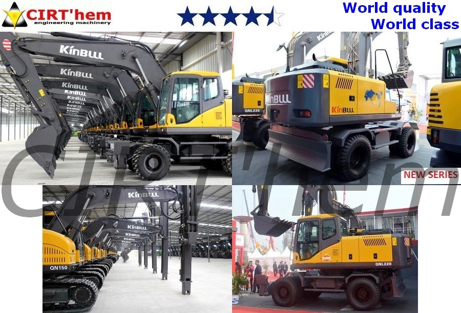L'industriel a dernièrement mis sur le marché sa nouvelle gamme (photos A) par des modèles plus modernes qu'auparavant et qui répondent pleinement aux plus sévères normes en vigueur, ces engins productifs sont d'une qualité de fabrication irréprochable et affichent des capacités et aptitudes pour le moins excellentes. Face au succès pharaonique de cette récente génération de pelles hydrauliques Chongqing Qinniu Kinbull s'est lancé dans une nouvelle phase de modernisation de sa principale et gigantesque usine (photos B) ce qui fait qu'aujourd'hui le constructeur possède un des plus modernes outils industriels du secteur et par une optimisation maximale de la production. La qualité même de fabrication des machines étant par ailleurs en forte augmentation puisque le fabricant s'est penché depuis peu sur l'exportation de sa production. Gros efforts financiers et industriels pour le constructeur qui est en mesure par le niveau qualitatif de ses pelles de s'attaquer de front aux concurrents y compris Européens car faut-il le rappeler ses modèles sur pneus de 7000 kilos à 22 tonnes sont de très sérieux adversaires. L'évolution de la gamme est permanente et la prochaine génération à venir pourrait fort bien être totalement différente de l'actuelle. Toujours est-il que les matériels de Chongqing Qinniu Kinbull et vendus sous le nom commercial de Kinbull justement font la grande appréciation des utilisateurs depuis de très longues années. On est dans du fiable, du robuste et du performant. Rien à envier à qui que ce soit !. Enfin des versions sur chenilles entrent actuellement en production mais également de la mini en rayon court à partir de 1800 kilos.
