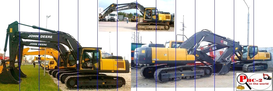 Pour les pelles sur chenilles comme sur pneus pas le moindre problème car le fabricant Chinois XCG (article en rubriques) suite à un accord mutuel est détenu rappelons-le à 50% par lui même et à 50% par Deere, conséquence de quoi et en application de la politique du constructeur Américain et toujours en accord avec Xcg les engins de ce dernier sont désormais vendus en Europe sous le nom de Deere (photo de gauche) contrairement jusqu'en 2009 sous le nom d'origine (photo de droite).